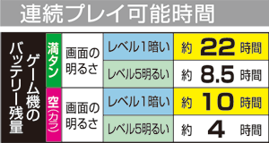 - 連続プレイ可能時間は、ゲーム機のバッテリーの状態、画面の明るさ、音量、無線通信の使用状況、使用するソフト、周囲温度などの使用条件により異なりますのであくまでも目安としてください。また、電池の銘柄等の個体差により十分な性能を発揮できない場合があります。